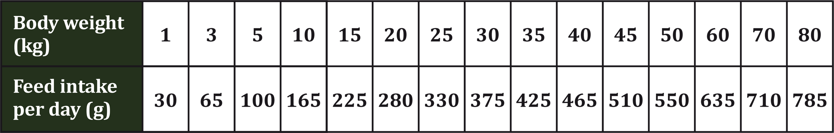 These instructions are a guideline only. An individual dog's requirements may differ from this guide according to e.g. age, body condition and activity levels. Feed 1 -2 meals per day. Initially feed daily amounts indicated in the table and then gradually adjust to maintain your dog in a lean condition. When introducing your dog to a new food, make the change gradually over 7-10 days, increasing the proportion of the new food each day. Fresh drinking water should always be available.