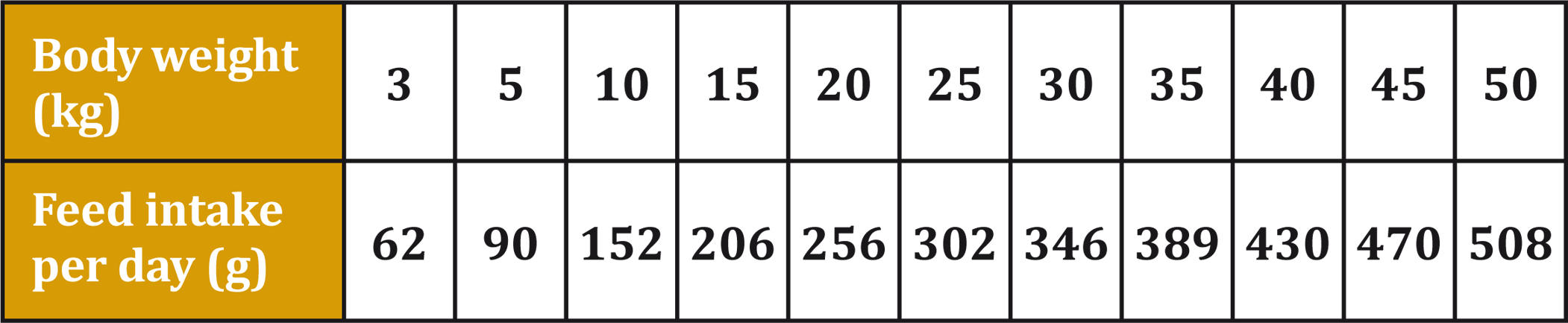 These instructions are a guideline only. An individual dog's requirements may differ from this guide according to e.g. age, body condition and activity levels. Feed 1 -2 meals per day. Initially feed daily amounts indicated in the table and then gradually adjust to maintain your dog in a lean condition. When introducing your dog to a new food, make the change gradually over 7-10 days, increasing the proportion of the new food each day. Fresh drinking water should always be available.